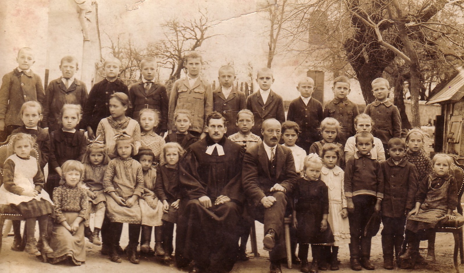 Pohánka Ödön, Ormosi Alfréd és az iskolások (1929). Háttérben a templom